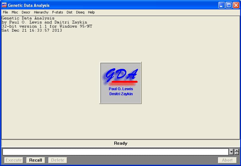 (Genetic Data Analysis) GDA یکی از نرم افزارهای مشهور برای آنالیز داده های ژنتیک جمعیت (هاپلوئید و دیپلوئید) است. از ویژگی های این نرم افزار می توان به موارد زیر اشاره کرد:
